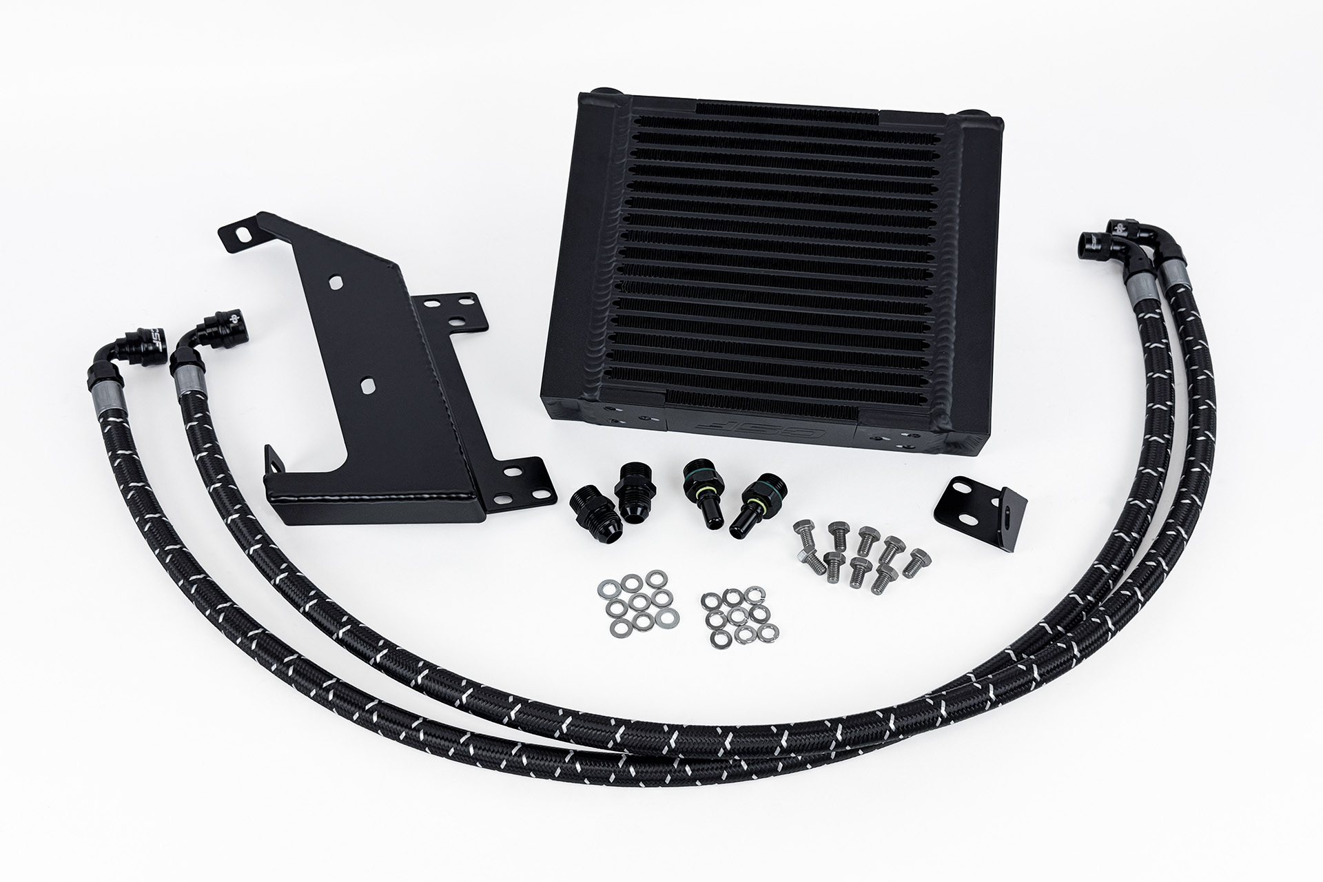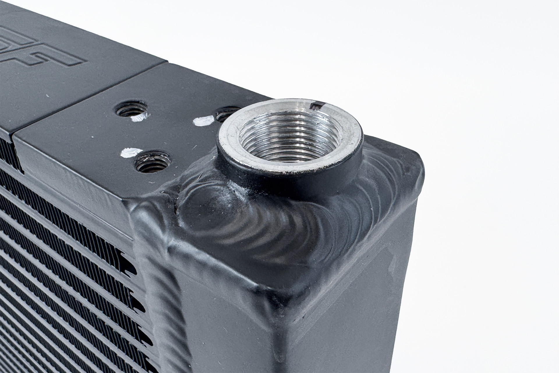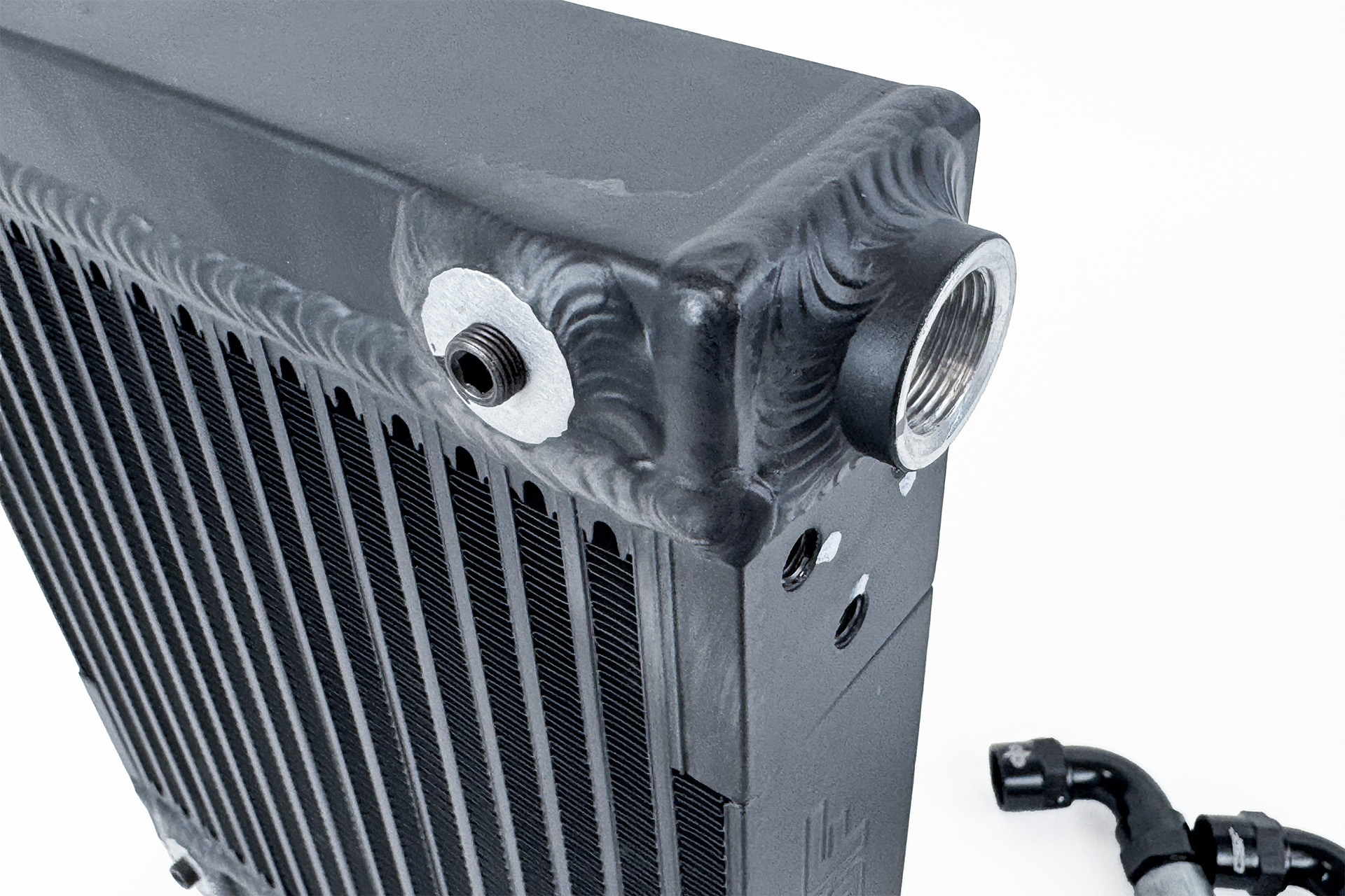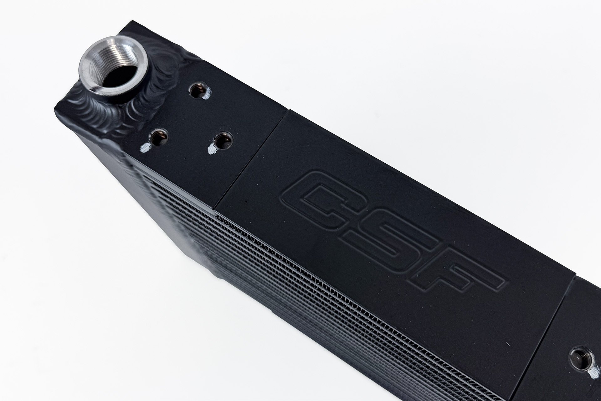 The laser cut mounting brackets bolt into the factory location requiring no modifications (drilling or cutting) to install. CSF also included pre-plugged 1/8 NPT ports on both tanks for running extra temp sensors or to use as bleeder ports. The oil cooler has a satin black finish for extreme protection against corrosion and debris.