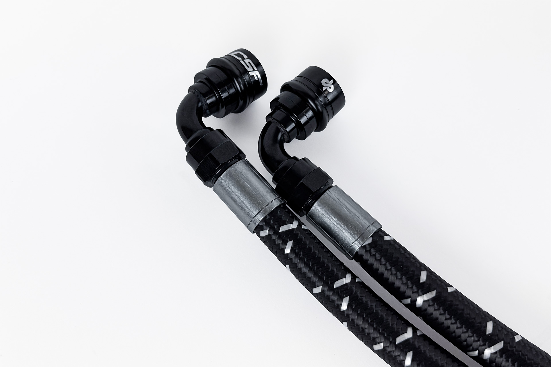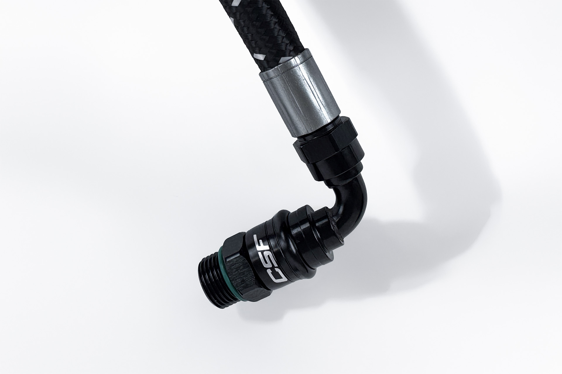 CSF partnered with DYME PSI for their exceptional quality and innovative quick-release hose and fitting solutions. The DYME Pro/Spec Quick Release Fittings offer race-proven performance with the convenience of tool-free clamshell removal and capable of withstanding up to 10,000 PSI. Quick Release fittings make the installation of the CSF kit much faster than traditional threaded fittings. In addition, they make maintenance like fluid changes much less of a headache.