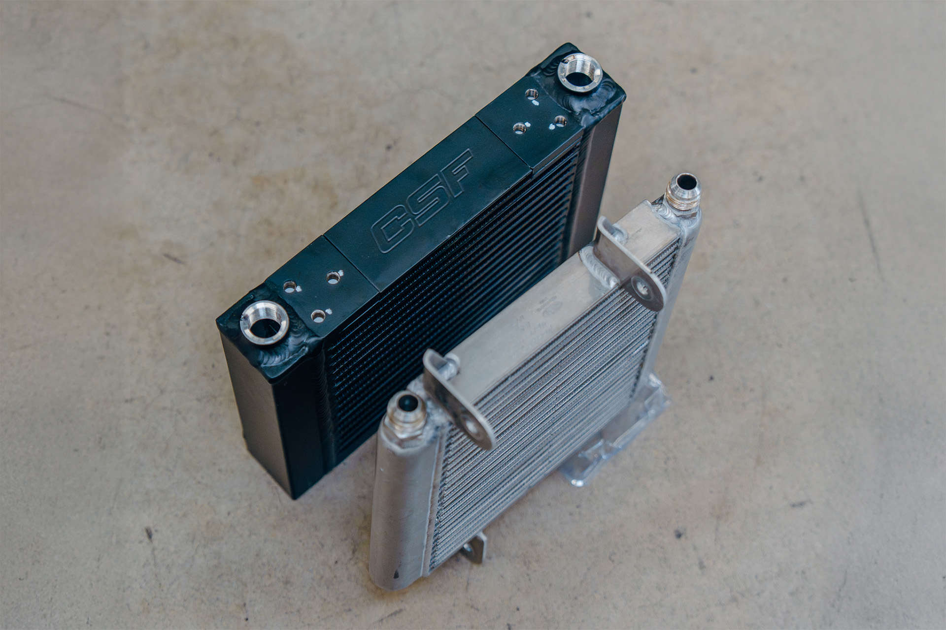 The original OE transaxle cooler worked fairly well given the design and cooler tech at the time. There is also room for improvement for the cooler and the original lines. CSF’s Transaxle Cooler kit features a robust Bar & Plate Oil Cooler paired with laser cut mounting brackets and Motorsports grade lines with patented quick release fittings by DYME PSI.