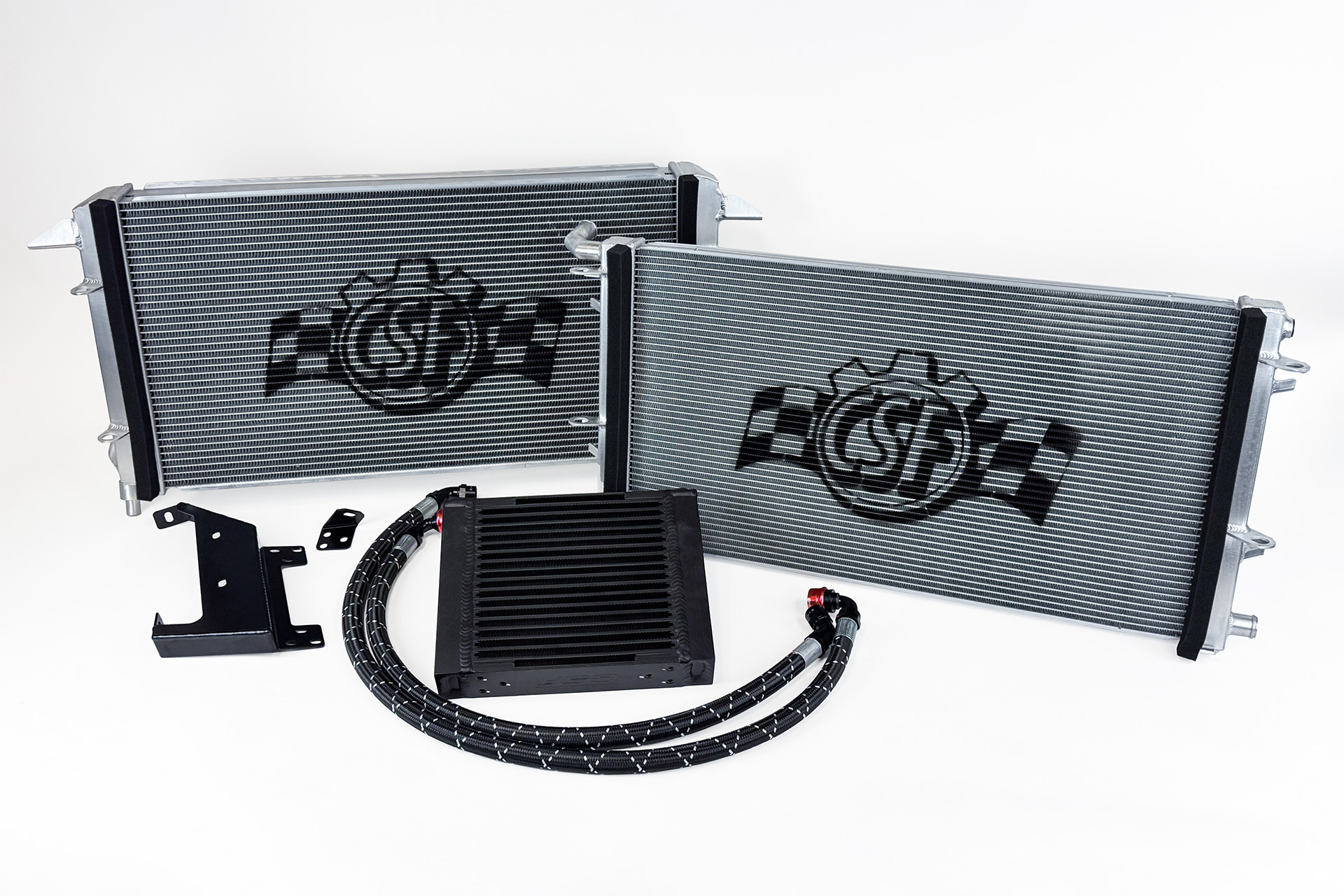 The CSF radiator features a 2-Row 68mm aluminum core that greatly improves the cores ability to dissipate heat. CSF’s Exclusive B-Tube Technology increases the heat transfer by approximately 15% over regular oval welded tubes. Between the 4 additional rows of cooling tubes/fins and 2-row core, the CSF Radiator outperforms the OEM unit by a significant margin. In addition, the super-efficient multi-louvered fins maximize airflow through the core for the best possible performance. The radiator mounts in the factory location and requires no modifications or cutting. It can be paired with the OE heat exchanger or the new CSF #8365 High-Performance Supercharger Heat Exchanger.