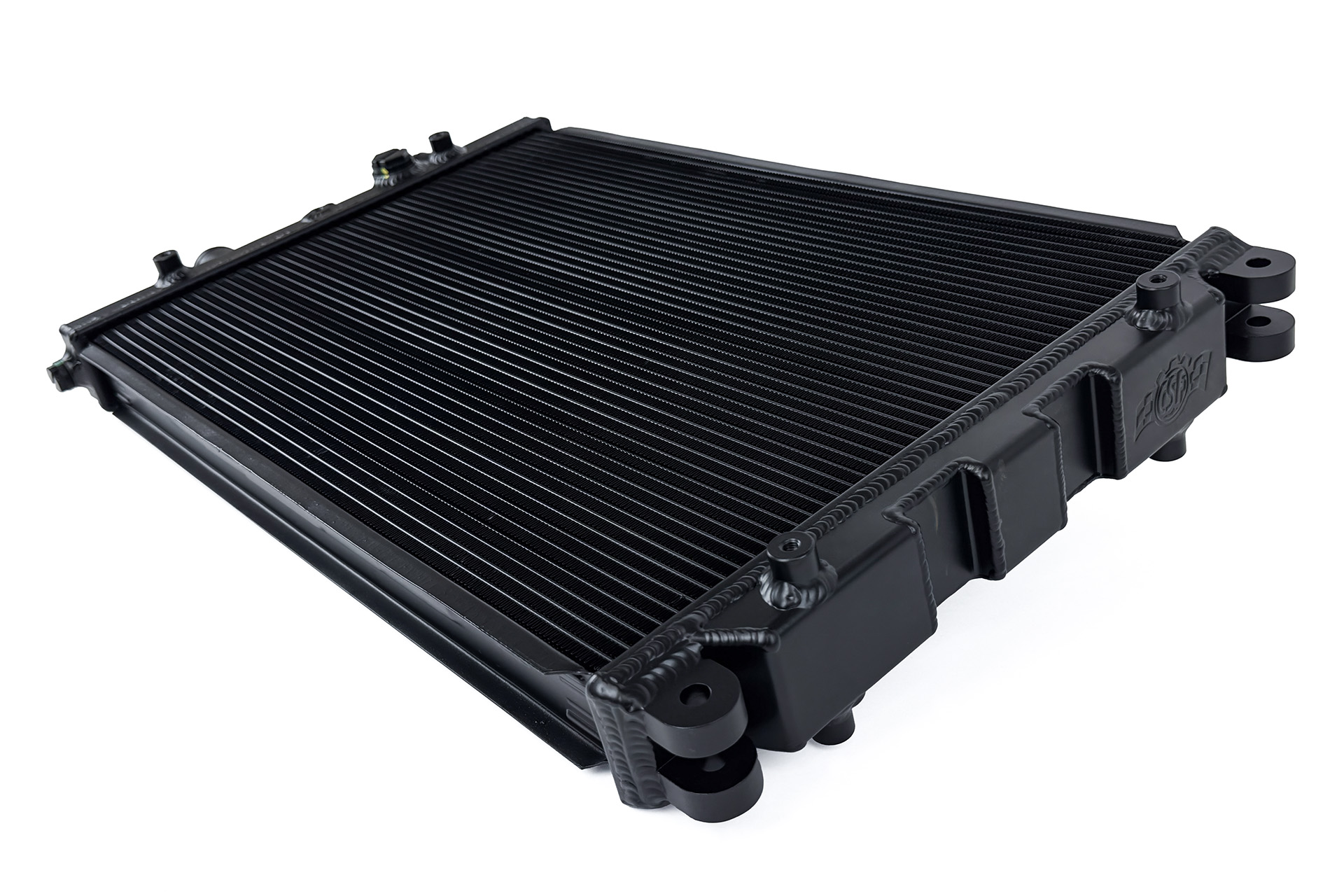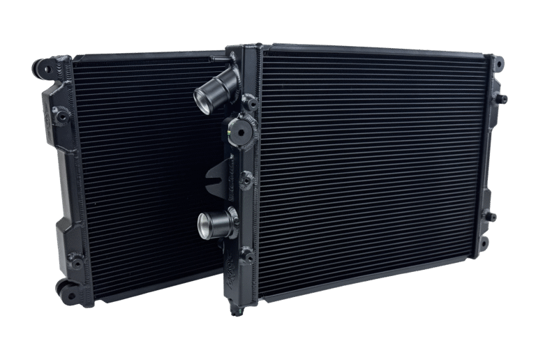 The CSF radiators feature the latest 5mm multi-louvered fins. These fins significantly increase the heat exchange surface area improving overall cooling efficiency and recovery while still maintaining good airflow. The core is much larger than the factory featuring 2-Row 42mm aluminum core. This both increases the fluid capacity of the radiator, and improves the cores ability to dissipate heat. The use of CSF’s 5mm fins also allowed for 12 additional cooling tubes and fin rows.